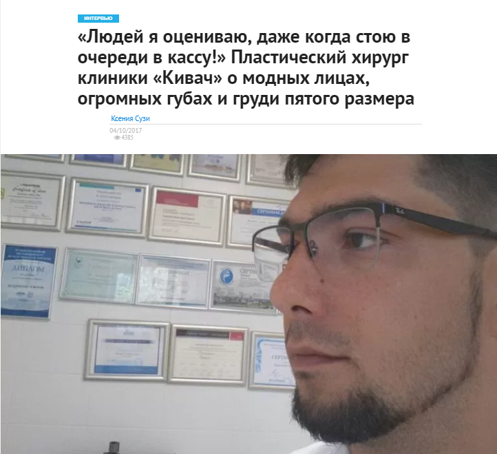 | «Людей я оцениваю, даже когда стою в очереди в кассу!» Пластический хирург клиники «Кивач» о модных лицах, огромных губах и груди пятого размера. Интервью пластического хирурга клиники «Кивач» Дмитрия Карманова. https://gubdaily.ru ![]() |